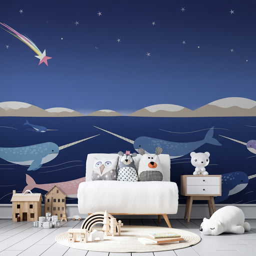 KidsWallPonořte sa do kúzelného sveta s týmto tapetou pre deti, ktorá zobrazuje farebné narvaly plávajúce v hviezdnatých vodách. Tieto tajomné morské tvory...