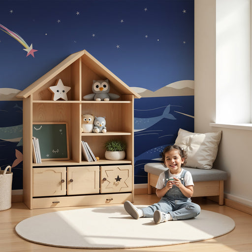 KidsWallTransformujte svet svojho dieťaťa s týmto tapetou pre deti, ktorá evokuje cestovanie pod hviezdami. V tichom nočnom prostredí sa veľryby pokojne vy...