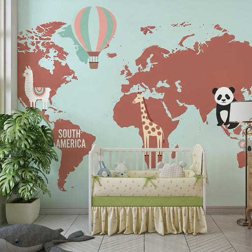 Zobraziť všetky podrobnostiDetská izba tapeta | Hráva mapa sveta s zvieratami a balónom.
