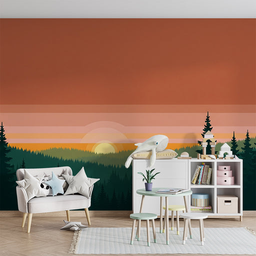 KidsWallPremaľujte izbu svojho dieťaťa na skutočný prírodný obraz s touto tapetou pre deti, ktorá zobrazuje nádhernú lesnú krajinu pri západe slnka. Siluet...