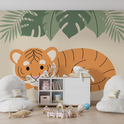 KidsWallVezmite svoje dieťa do divokého a fascinujúceho sveta s týmto tapetou pre deti, ktorá zobrazuje majestátneho tigra, ktorý pokojne odpočíva na tropi...