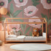 Jemný ružový pozadie zvýrazňuje odtiene kvetov, zatiaľ čo zelené listy pridávajú prírodný a živý dotyk. Tento kvetinový dizajn, zároveň elegantný a jemný, láka k sneniu a fantázii, čím z izby vášho bábätka robí očarujúce miesto.