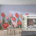 Tulipány a jemné kvety sa harmóniou miešajú, prinášajúc do miestnosti nádych poézie a sviežosti. Subtílny fialový pozadie priťahuje pohľad, ale nie je príliš dominantné, ponúkajúc ideálne prostredie pre spánok a snívanie.