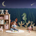 Nežne barve morja in nočnega neba ustvarijo mirno vzdušje, idealno za spodbujanje spanja vašega otroka. Ta edinstven dizajn bo prinesel čaroben dotik v sobo, hkrati pa bo spodbudil radovednost do morskega življenja. Mehke oblike in zabavne poteze naredijo to morsko okolje prijetno in toplo.