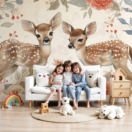 KidsWallPreobrazite otroško sobo v očarljiv svet s tem otroško tapeto. Trije srnjaki z nežnimi in prijaznimi pogledi stojijo v središču cvetlične scene, ok...