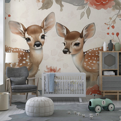 Ozadje za otroško sobo | Srne in pastelno cvetje v cvetlični harmoniji