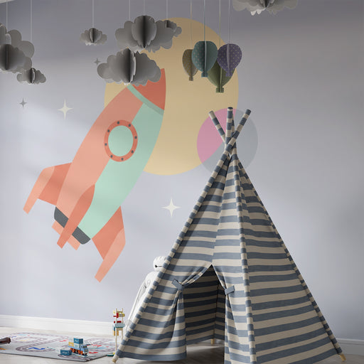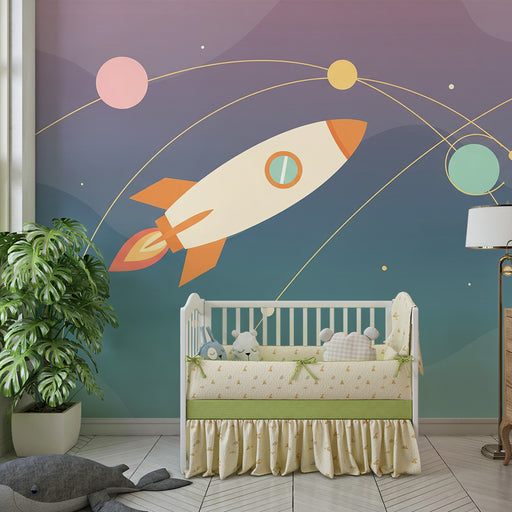 KidsWallPodajte na intergalaktično pustolovščino s to tapeto za otroke, ki prikazuje dinamično raketo, ki se dviga proti pisanim planetom. Mehko in pasteln...
