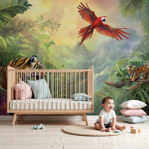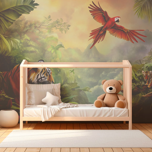 Tapeta za otroško sobo | Bujna džungla s tigri in rdečim papagajem
