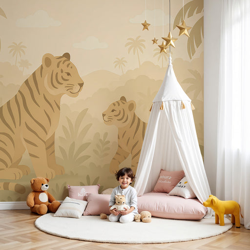 Potopite svojega otroka v središče bujne džungle s to tapeto za otroško sobo, pravo potopitev v eksotičen in fascinanten svet. Predstavljajte si živahno naravo, polno gostega listja, kjer šumenje listov spremlja veličasten napredek tigra in njegovega mladiča. V tej živahni pokrajini škrlatni papagaj razpre svoja krila nad to divjo sceno, prinašajoč pridih svobode in dinamike.