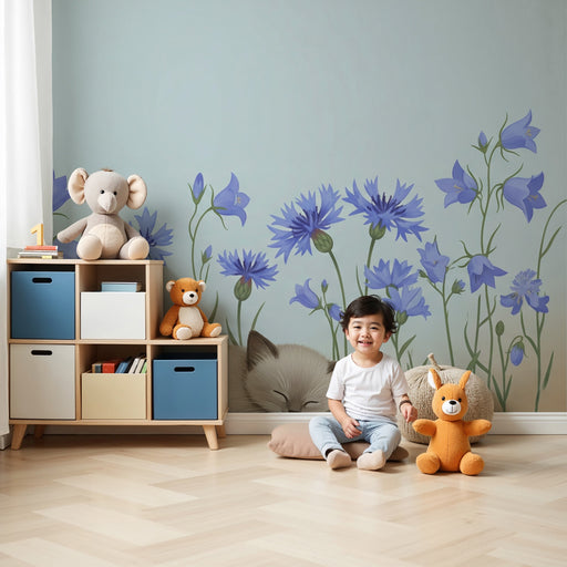 Kinderkamer behang | Sladko spalnično ozadje z muckom med modrimi cvetovi