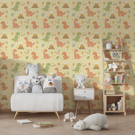 KidsWallPrinesite igrivo noto v otroško sobo s to tapeto za otroško sobo, okrašeno z veselimi dinozavri in prazgodovinskimi pokrajinami. Barvni vzorci, ki ...
