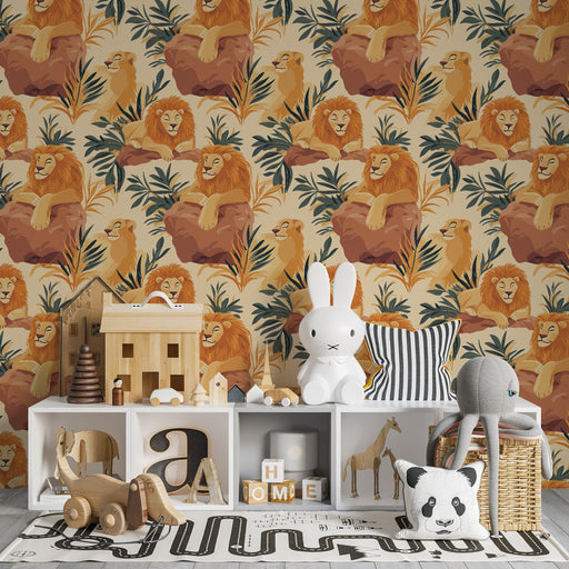 KidsWallPonovno izumite otroško sobo in jo spremenite v pravo kraljestvo savane s to tapeto za otroško sobo, ki prikazuje mogočne leve, ki počivajo na skal...