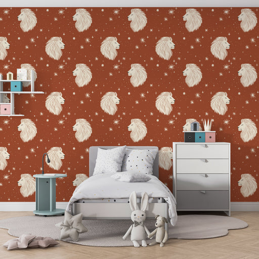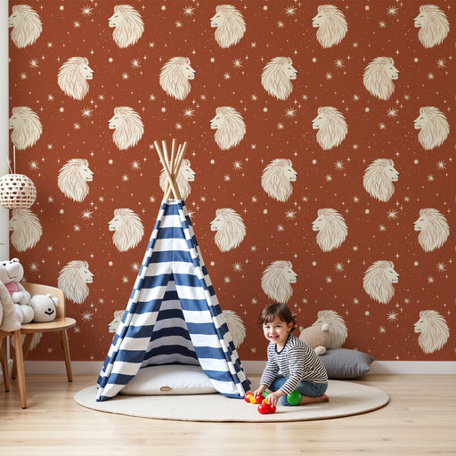 Kids room wallpaper with patterns | Elegant lion heads on rust background