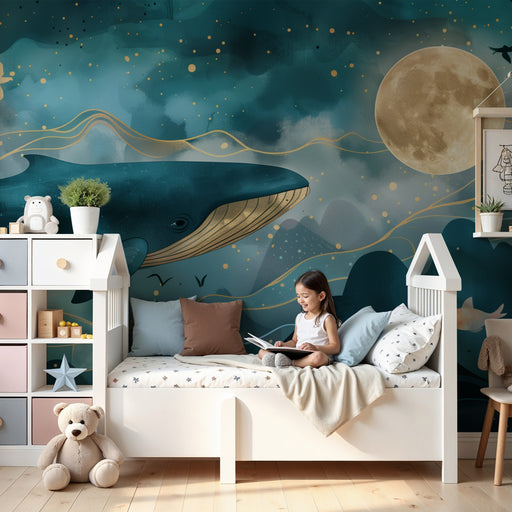 KidsWallPotopite svojega otroka v čarobni svet s to tapeto za otroško sobo, kjer veličastni sanjavi kit mirno drsi pod zlato luno. Prepustite se temu nočne...