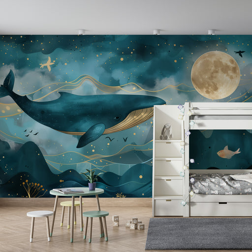 KidsWallVnesite poezijo oceanov in zvezdnatega neba v otroško sobo z tapeta za otroško sobo. Veličastni zlati kit lebdi na nočnem nebu, obsijan z svetlo lu...