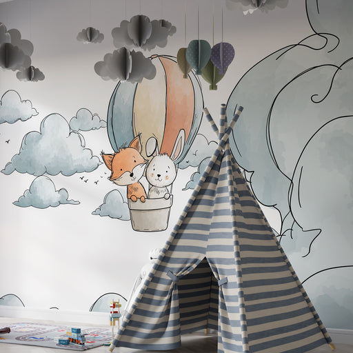 KidsWallOdpravite se na avanturo v balonu s tem barvnim otroškim tapetom. Ljubek lisjak in prijazen zajček letita proti nebu, obkrožena s puhastimi oblaki ...