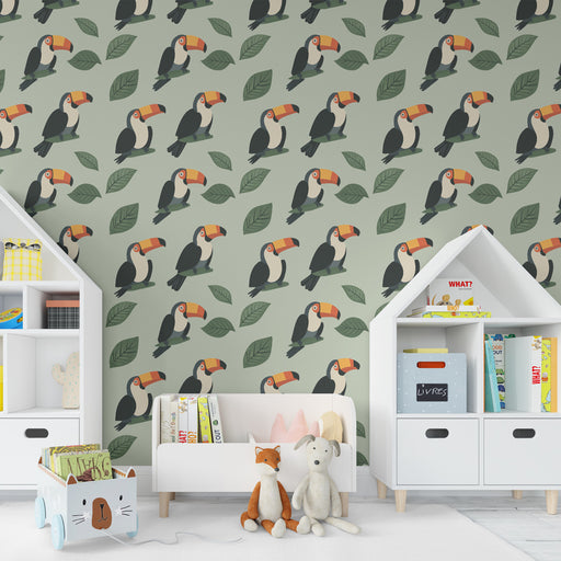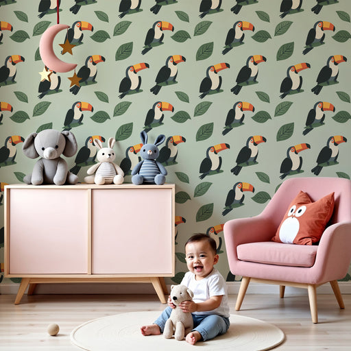 KidsWallPrinesite dotik tropskega v svojo otroško sobo s to tapeto za otroško sobo, okrašeno z čudovitimi tukani. Ti ptice z bleščečim perjem nežno sedijo ...