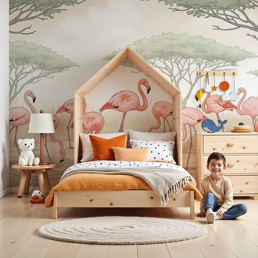 KidsWallUstvarite čarobno in naravno vzdušje v otroški sobi s to tapeto za otroke, ki prikazuje roza plamenke, ki se zbirajo v savanski pokrajini. Ti graci...