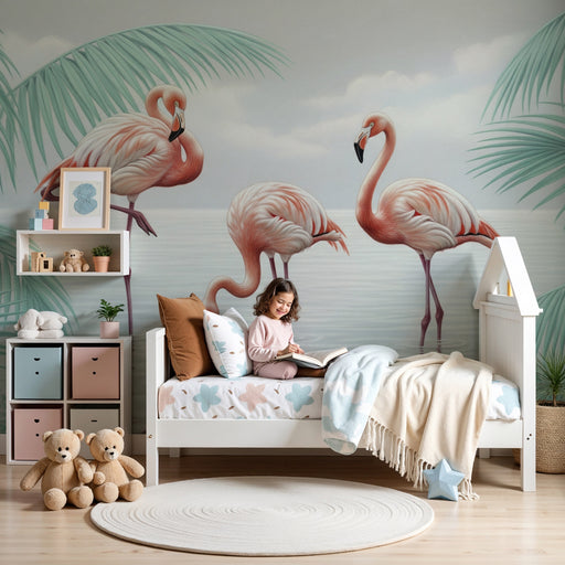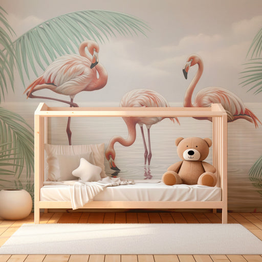 KidsWallPrinesite nežnost in čarobnost v otroško sobo s to tapeto za otroke, ki prikazuje veličastnega rožnatega flaminga. Izstopajoč iz dekorja nežnih tra...
