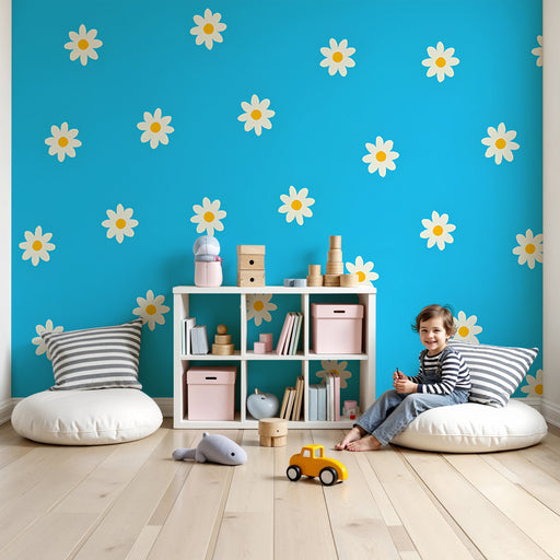 KidsWallOkrasite otroško sobo s to tapeto za otroško sobo z nežnimi vzorci marjetic na modrem ozadju. Bele rože z njihovim živahnim rumenim srcem prinašajo...