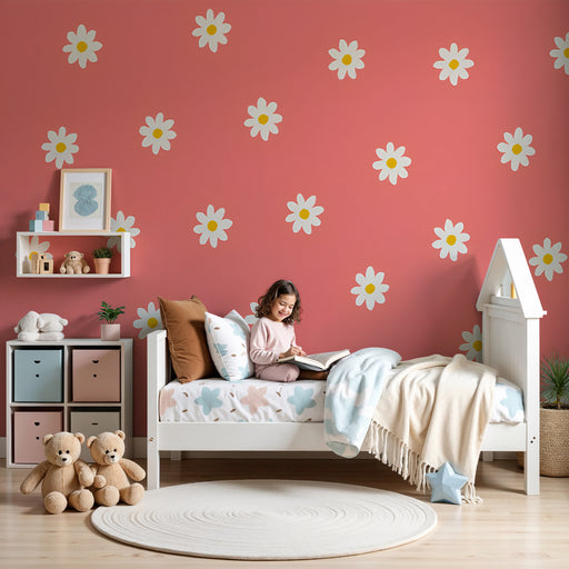 Prikaži vse podrobnostiKids room wallpaper | White flowers on coral background
