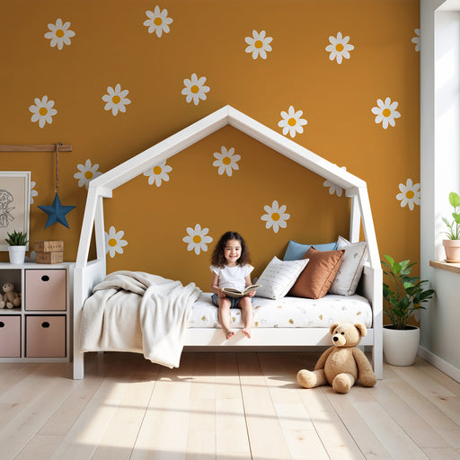 KidsWallPrinesite svežino in veselje v otroško sobo s to tapeto za otroke, okrašeno z nežnimi belimi cvetovi na svetlo rumenem ozadju. Ta cvetlični vzorec ...