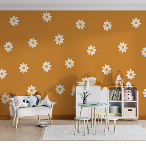 KidsWallDodajte pridih svežine in toplote v otroško sobo s to tapeto za otroke, okrašeno z drobnimi belimi cvetovi na toplem oranžnem ozadju. Ta igriv in b...