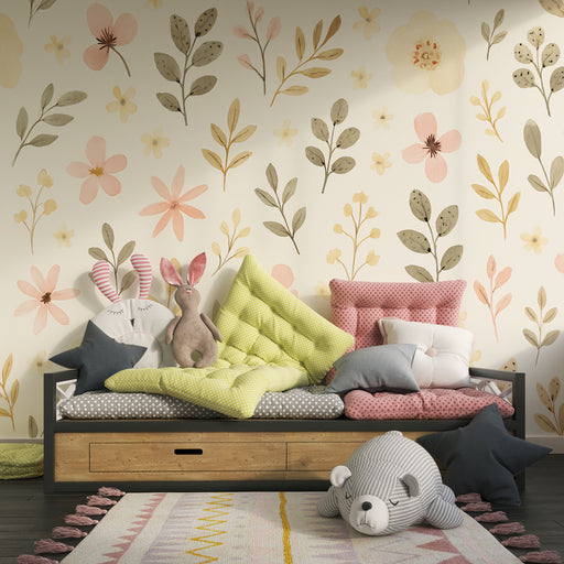 KidsWallPrinesite nežnost in svežino v otroško sobo s to otroško tapeto z nežnimi cvetličnimi motivi. Cvetje in bele liste na umirjenem bež ozadju ustvarja...