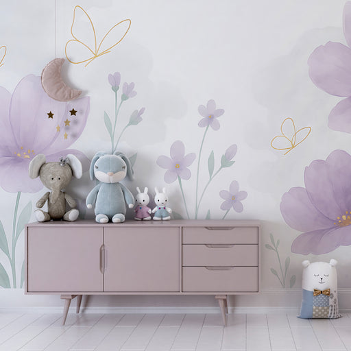 KidsWallOkrasite otroško sobo s tem čudovitim otroškim tapetom s pastelnimi cvetovi in lahkim metulji. Nežni odtenki vijolične in zelene ustvarjajo pomirju...