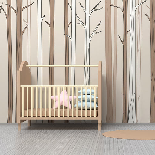 Prikaži vse podrobnostiPapier de parede otroška soba | Pomirjujoča gozdna scena v odtenkih bež.