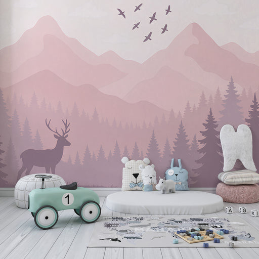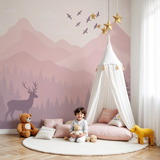 KidsWallPreoblikujte otroško sobo v oazo miru, navdihnjeno z naravo, s to čudovito tapeto, ki prikazuje očarljiv gozd. V nežni rožnati paleti se ponosno dv...