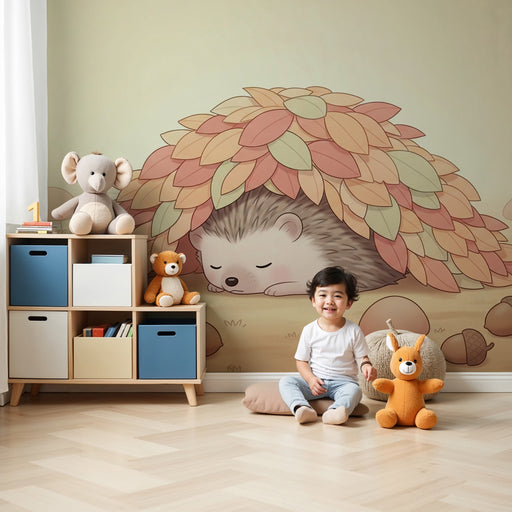 Prikaži vse podrobnostiKinderkamer behang | Nieuwsgierige egel en zachte bladeren
