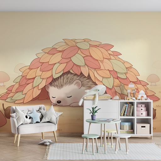 KidsWallUstvarite čaroben svet v otroški sobi s to tapeto za otroke, ki prikazuje ljubkega ježka, ki mirno počiva pod zavetjem pisanih listov. V središču d...