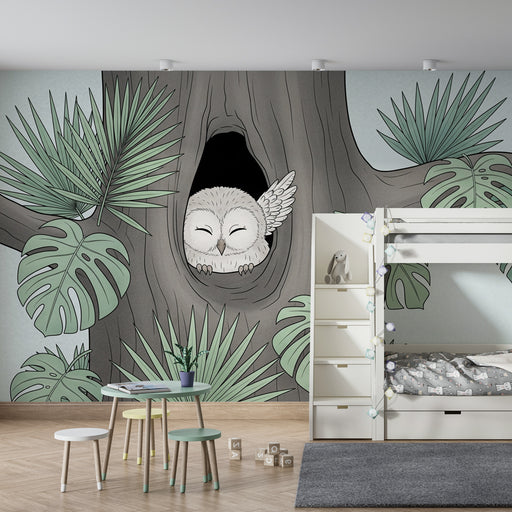 KidsWallOživite otroško sobo s to tapeto za otroke, ki prikazuje očarljivega sovega, skritega med bujnim listjem. Ilustracija igra z umirjenimi zelenimi od...