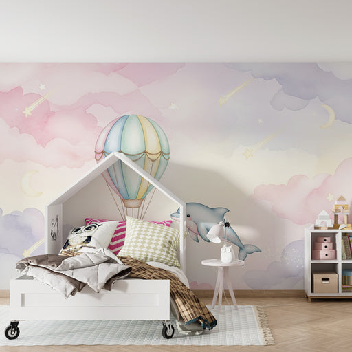 Prikaži vse podrobnostiKinderzimmer Tapete | Heißluftballon und Delfin in den Wolken