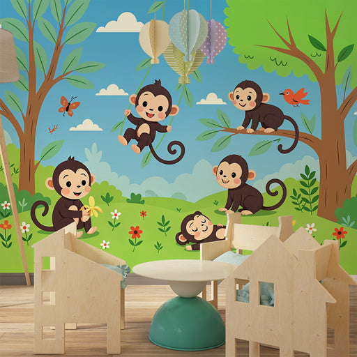 KidsWallOdkrijte naš tapet opic, popoln za otroške sobe ali igralnice. Ta zabaven dizajn prikazuje vesele opice, ki se zibajo med džungelskimi listi in ban...