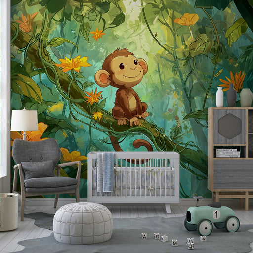 KidsWallDodajte igriv in barvit dotik v otroško sobo z našim tapetami opice. Ta živahen dizajn prikazuje ljubko opico sredi bujnega deževnega gozda, obkrož...