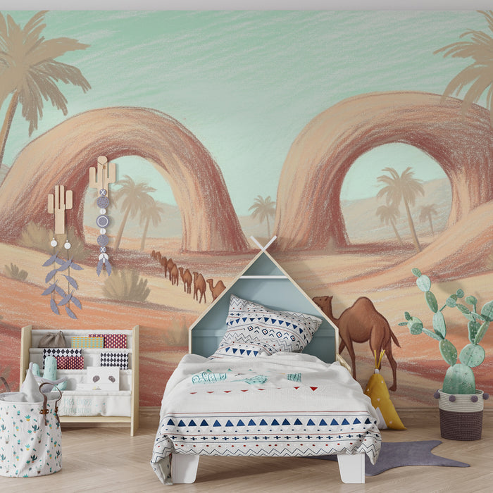 Preoblikujte otroško sobo v svet pustolovščin s to tapeto navdihnjeno z puščavo. Kameli hodijo v vrsti, ustvarjajo fascinantno vzdušje med peščenimi sipinami in eksotičnimi palmami. Sanjska pokrajina prikliče oddaljena raziskovanja in čar puščavskih pokrajin.