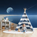 Globoki modri odtenki in čista belina vzbujajo mirnost in radovednost, popolno za spodbujanje domišljije malih raziskovalcev. Vsak detajl, od minimalistične pokrajine do padajočih zvezd, je zasnovan, da vašega otroka popelje v svet, kjer je vse mogoče.