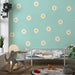 Prinesite svežino in veselje v otroško sobo s to tapeto za otroke okrašeno z nežnimi belimi cvetovi. Svetlo modro ozadje ustvarja pomirjujoče vzdušje, popolno za prostor za počitek in sanje. Vsak cvet z bleščečim rumenim središčem doda veselo in igrivo noto.