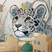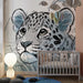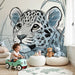 Nežni odtenki modre in bež ponujajo pomirjujoče vzdušje, idealno za okolje, ki spodbuja sanjarjenje in raziskovanje. Drobnosti ilustracije, od značilnih peg leoparda do nežno narisane trave, dodajo edinstveno in umetniško dimenzijo dekoraciji sobe.