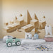 Preproste oblike in subtilne sence dodajajo globino, vsak zid pa naredijo privlačen, ne da bi bil vsiljiv. Ta dekor je idealen za spodbujanje domišljije vašega malčka in hkrati ustvarja sproščujoče vzdušje za spanje in igro.