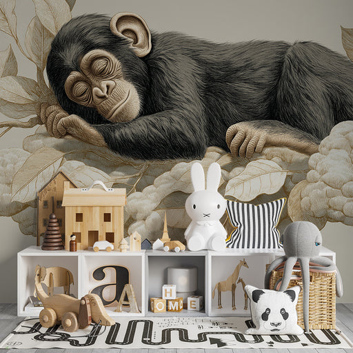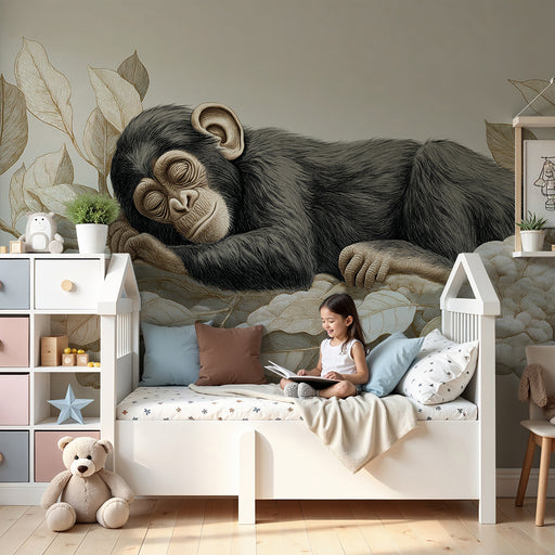 Skapa en lugnande och exotisk atmosfär i ditt barns rum med vår sovande apa och lövverk tapet. Denna delikata illustration visar en bedårande apa s...