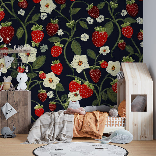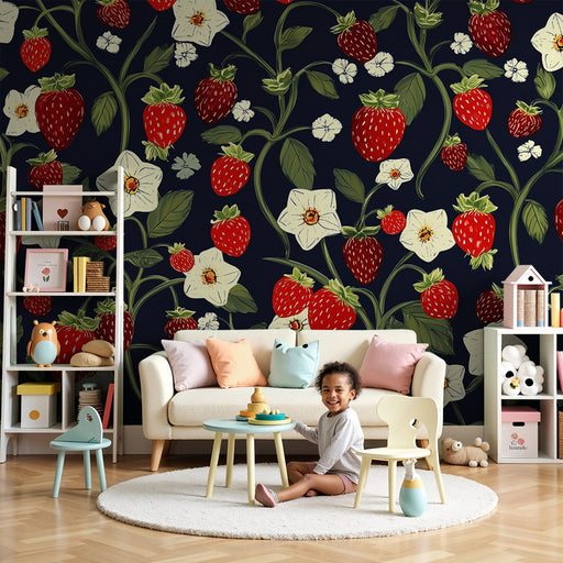 Visa alla detaljerBarntapet | Jordgubbar och blommor på mörk bakgrund