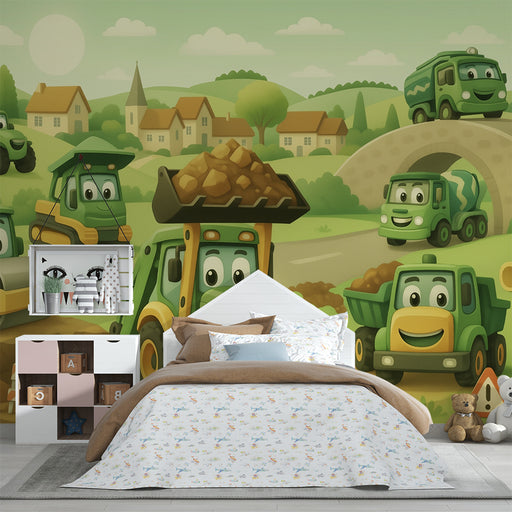 Visa alla detaljerBarntapet | Glada gröna bygglastbilar