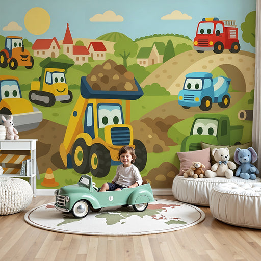 KidsWallTransformera ditt barns rum med vår Barntapet med glada byggfordon. Denna lekfulla och charmiga design visar leende byggfordon, perfekt för att sti...