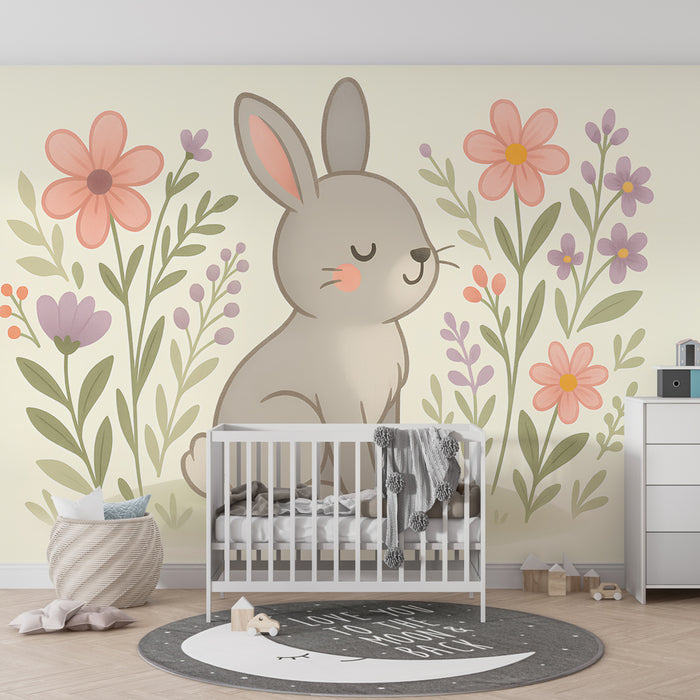 De levande blommorna, från stora rosa prästkragar till delikata violer, omger kaninen och skapar en glad och lugnande miljö. Pastellfärger blandas harmoniskt och skapar en lugn atmosfär, perfekt för att främja lugn och fantasifullhet hos de allra minsta.