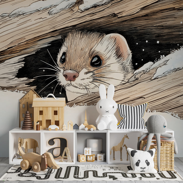 Upptäck vintermagin med denna barn tapet, som visar en bedårande vessla som kommer fram från sitt skydd under barken. Den vinterlandskapet, med sin mjuka snö och tränyanser, skapar en fängslande och varm miljö som kommer att väcka ditt barns fantasi.