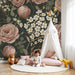 Den mörka bakgrunden framhäver de pastellfärgade blommorna och ger en touch av elegans och lugn till utrymmet. Varje detalj är noggrant utformad för att ge en harmonisk effekt, stimulera din lilla fantasi och lägga till en touch av sofistikering i dekoren.