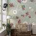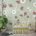Ge din bebis rum en touch av mjukhet och fräschör med denna barnrum tapet dekorerad med delikata blommor. På en lugnande pastellgrön bakgrund blommar rosa blommor, omgivna av vita och gyllene cirklar som lägger till en lekfull och charmig touch.